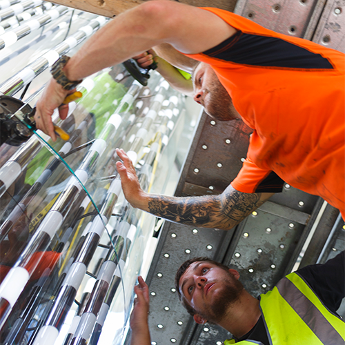 Our studio managed Flow and Pause from concept to implementation, developing detailed construction documentation and engineering solutions to bring the artwork to life. In collaboration with specialist lighting designers, we created a custom double-sided LED system to achieve its dynamic illumination. Throughout installation, we maintained a particle-free environment in the glass chamber, ensuring the pristine presentation and integrity of the work.